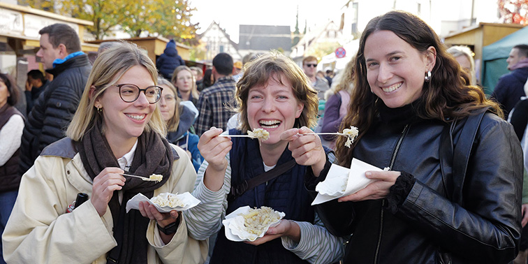 Freilich stehen die unterschiedlichen Genüsse und Zubereitungen des feinen Filderkrauts im Mittelpunkt der größten deutschen Krauthocketse! Und falls Sie es noch nicht wussten, dann werden Sie staunen, welche Schlemmereien sich aus einem Spitzkrautkopf außer Sauerkraut so zaubern lassen. Krautwickel, Schlachtplatte, Schupfnudeln, mit Kraut gefüllte Rouladen – und nicht zu vergessen: die Original Echterdinger Deie und der nach altem Rezept hergestellte Echterdinger Krautkuchen, beides von den Landfrauen in bester Handarbeit im historischen Backhaus gebacken.