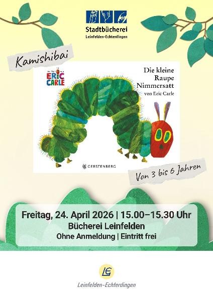 Heute steht der Bilderbuch-Klassiker „Die kleine Raupe Nimmersatt“ im Mittelpunkt. Die kleine Raupe schlüpft aus dem Ei und hat nur noch Fressen im Sinn. Eine Woche lang frisst sie sich durch allerlei Obst und Süßigkeiten. Dann baut sie sich einen Kokon und entpuppt sich als farbenprächtiger Schmetterling.