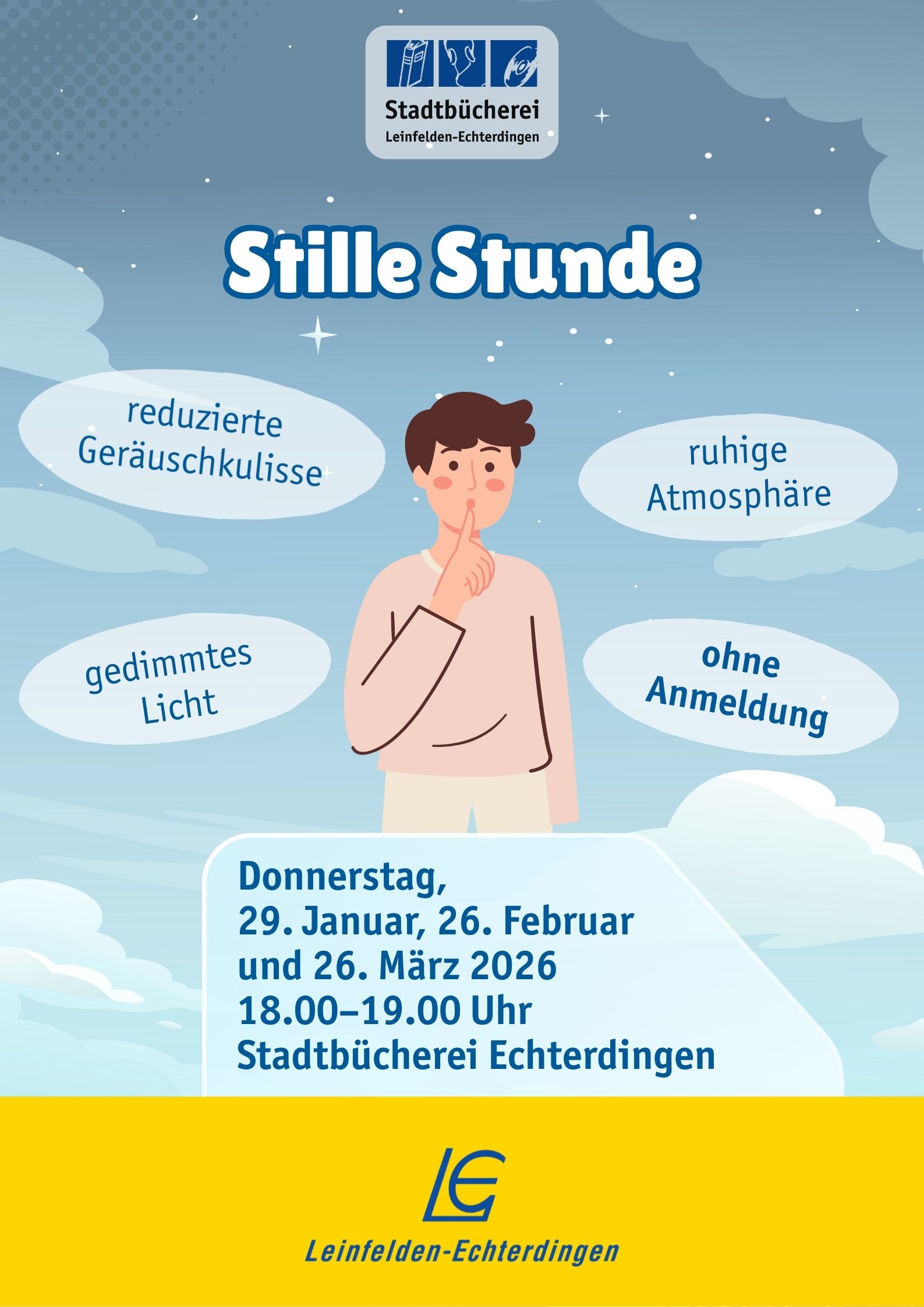 In den Monaten Januar, Februar und März lädt die Bücherei Echterdingen jeweils am letzten Donnerstag im Monat von 18 bis 19 Uhr zur „Stillen Stunde“ ein.