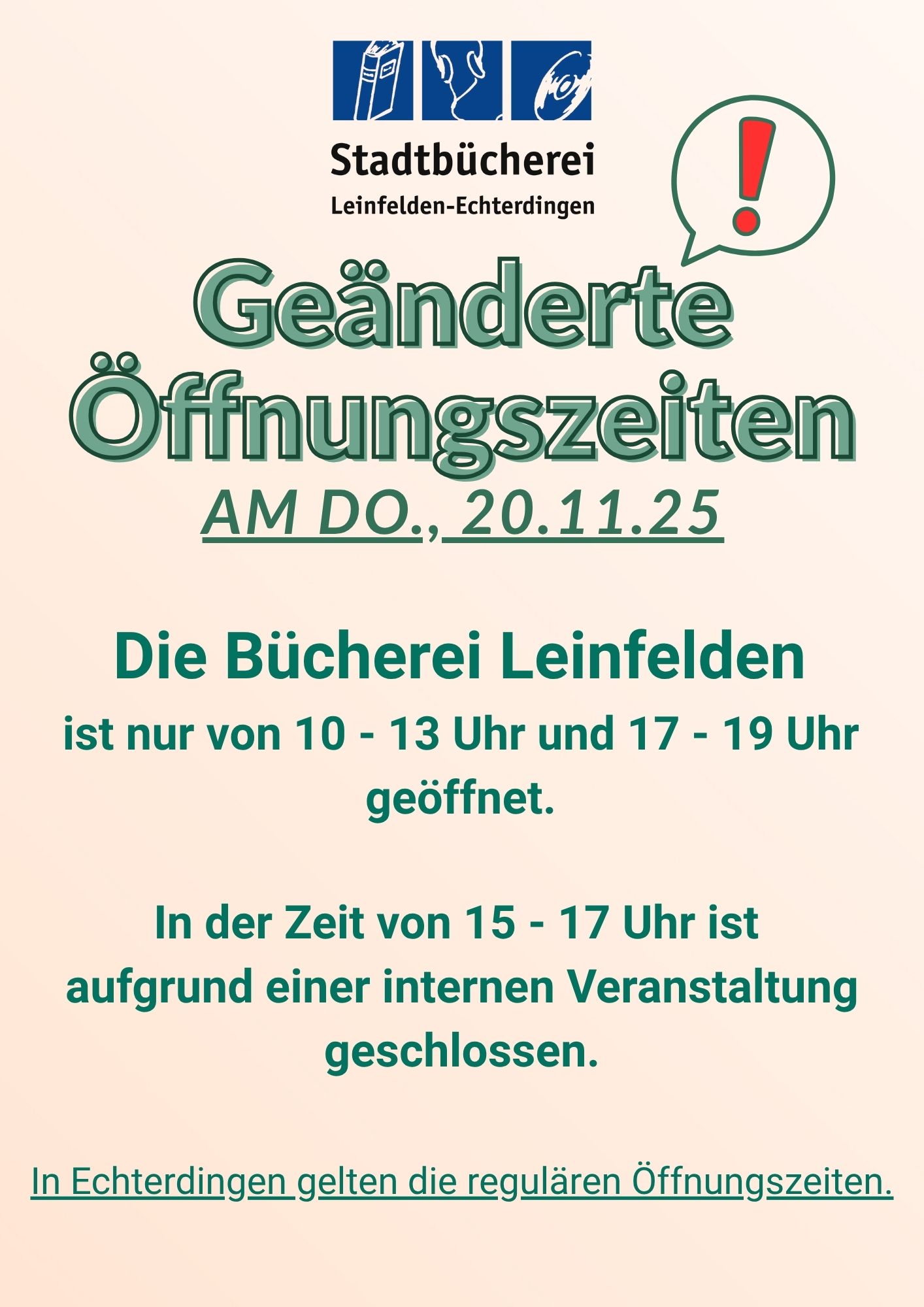 Geänderte Öffnungszeiten am 20.11.2025 in der Bücherei Leinfelden
