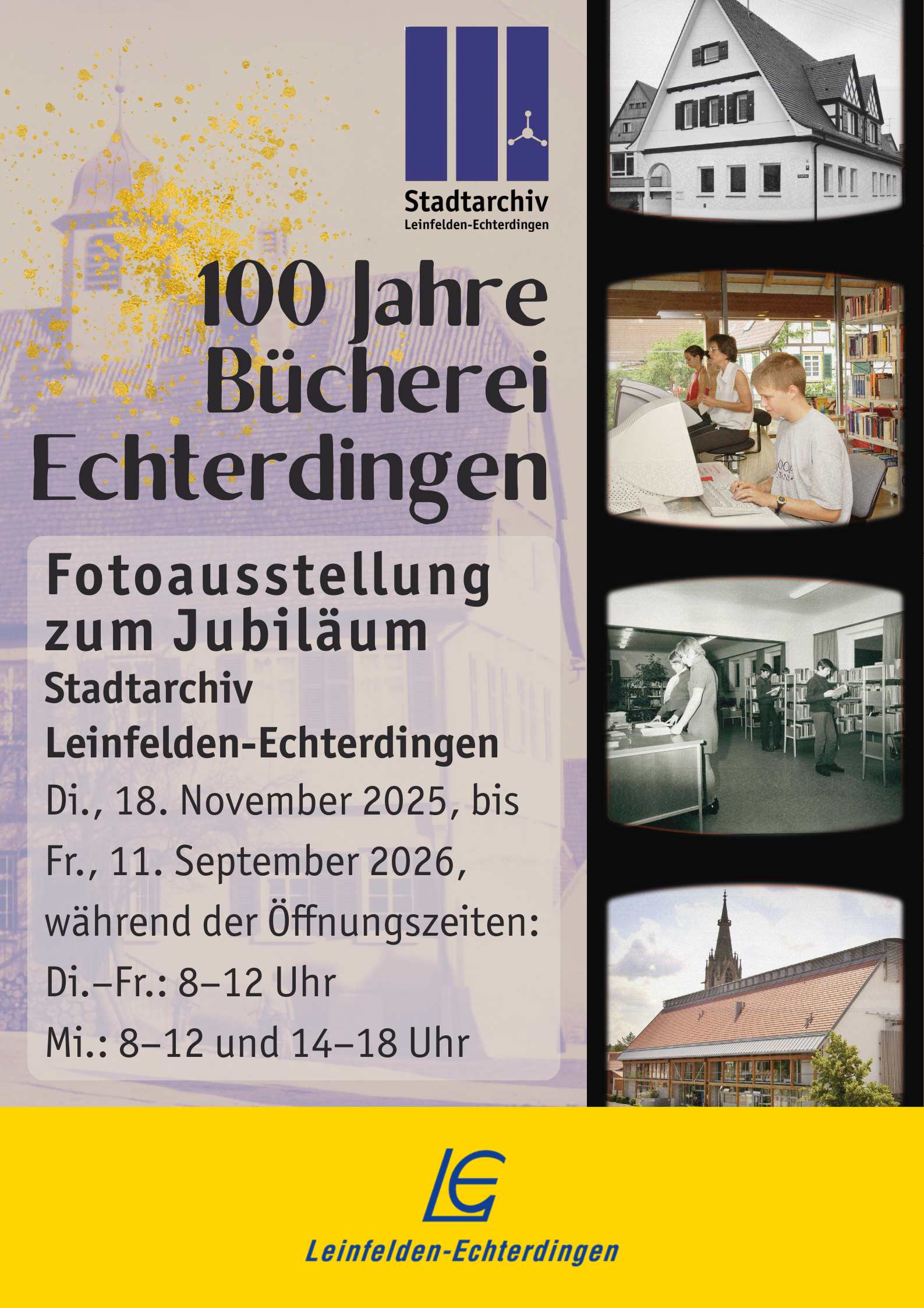 Die Bücherei Echterdingen wurde im Jahr 1925 als „Ortslesebibliothek“ gegründet und feiert dieses Jahr ihren 100. Geburtstag. Eine Fotoausstellung mit historischen Aufnahmen zeigt die Entwicklung der Bücherei von 1925-2025.