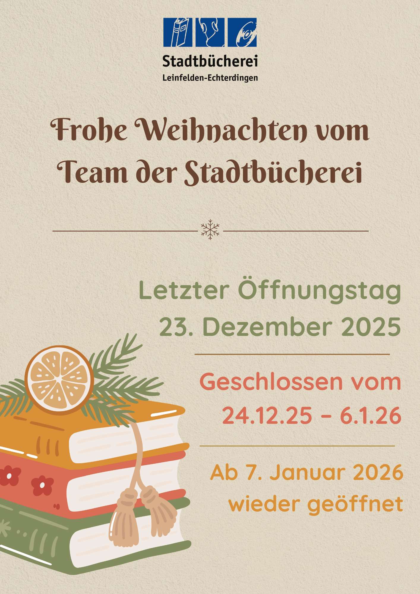 Das Team der Stadtbücherei wünscht Ihnen eine schöne Weihnachtszeit und einen guten Start ins neue Jahr!