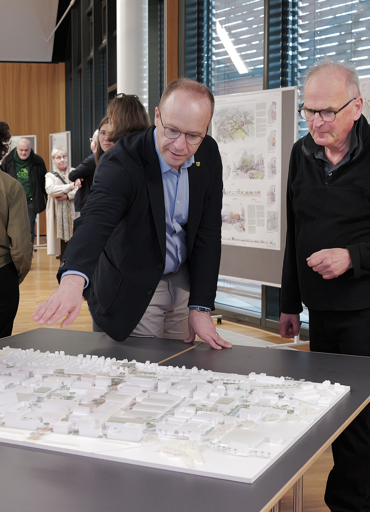 Oberbürgermeister Ruppaner sowie Vertreter des Siegerbüros nutzten die Gelegenheit ebenfalls für direkte Gespräche an den Plänen und Modellen. So entwickelte sich ein lebendiger Austausch zwischen Fachleuten, Stadtverwaltung und Bürgerschaft.