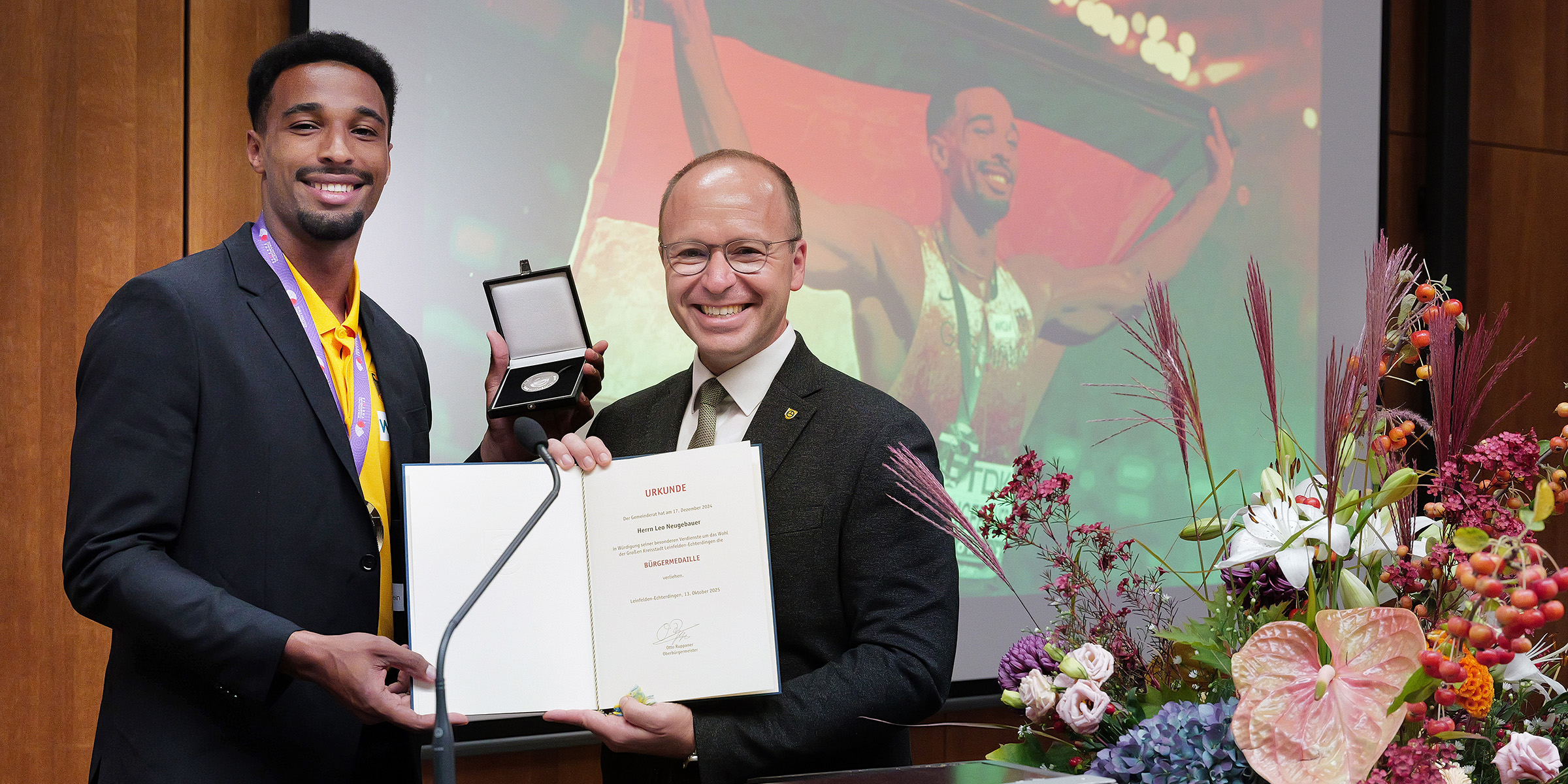 Im Rahmen eines feierlichen Empfangs in der Filderhalle wurde dem 25-jährigen Zehnkampf-Star die Bürgermedaille der Stadt verliehen. Zudem trug sich der Ausnahmeathlet in das Goldene Buch der Stadt ein – eine Ehre, die nur wenigen zuteil wird.