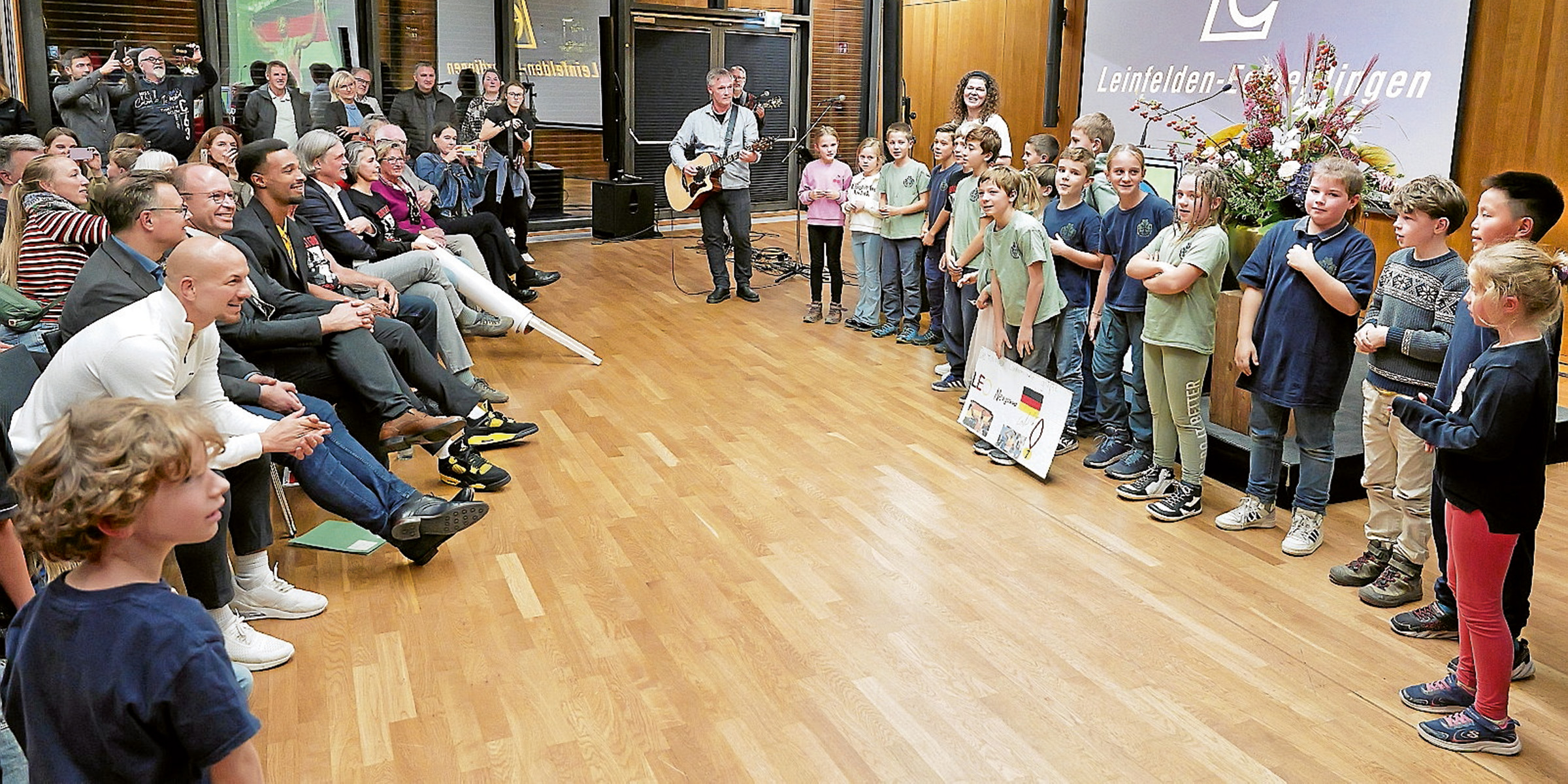 Ein besonders herzerwärmender Moment entstand, als Kinder der Stettener Lindachschule ihr Schullied präsentierten (Leo Neugebauer ging dort zur Schule). Zuvor richteten mehrere Schülerinnen und Schüler der vierten Klasse auf Englisch – Neugebauer studierte und lebt aktuell ja in Austin (Texas) – neugierige Fragen an den Weltmeister, etwa nach seinem Lieblingsfach, seiner Lieblingsfarbe oder seinen Schulnoten. Neugebauer antwortete charmant und schlagfertig und brachte die Kinder mit humorvollen Anekdoten zum Lachen. So nannte er nach kurzem Überlegen „Gold“ also seine Lieblingsfarbe – natürlich in Anspielung auf seinen jüngst erzielten WM-Titel!