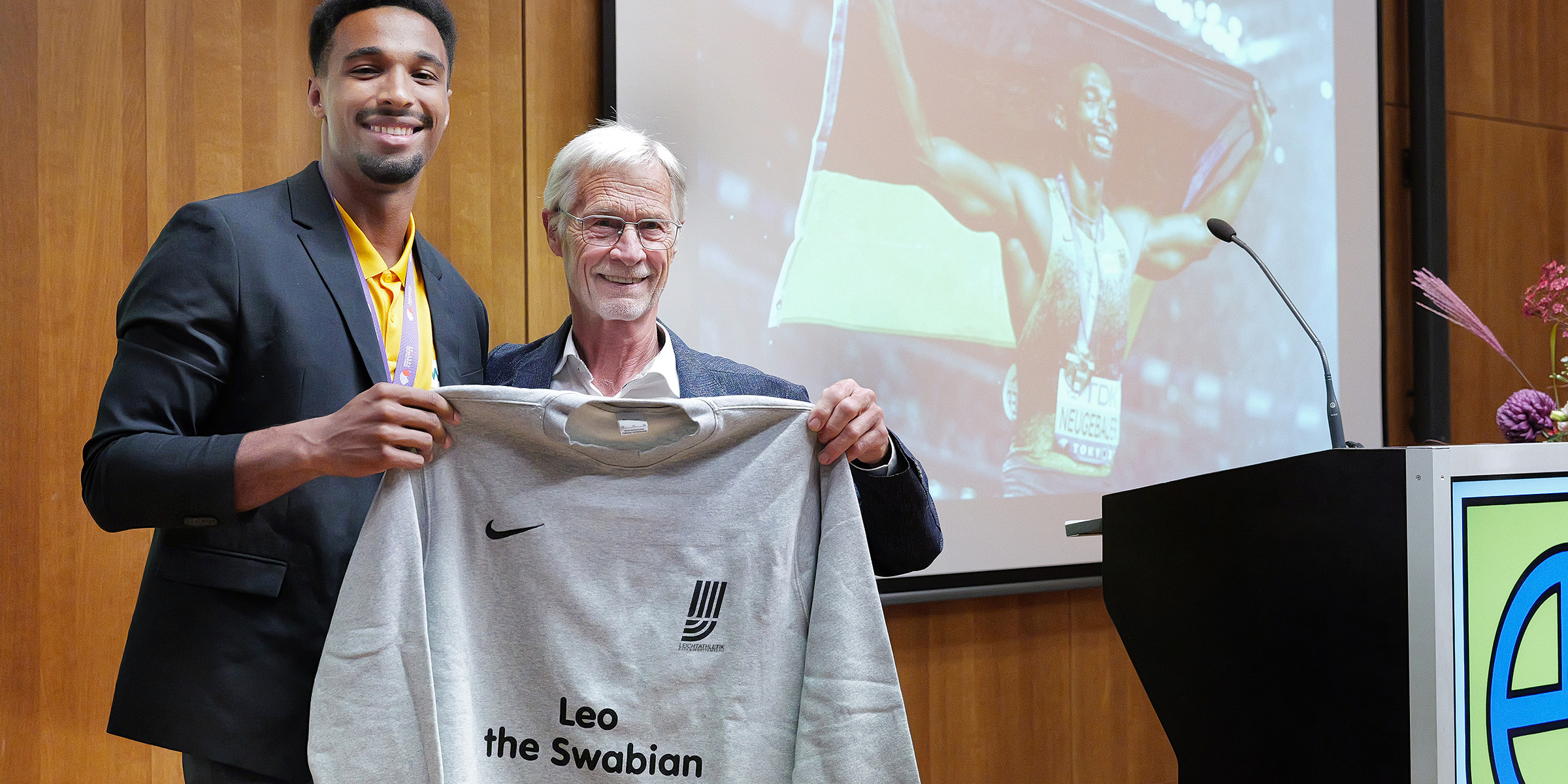 Dieter Schneider vom Württembergischen Leichtathletik-Verband ließ Neugebauers sportlichen Werdegang Revue passieren und würdigte ihn als Ausnahmesportler mit Bodenhaftung. „Wir alle sind überzeugt, dass er weiterhin Sportgeschichte schreiben wird.“ In den USA nenne man ihn „Leo, the German“. Schneider überreichte ihm ein Shirt mit dem Aufdruck „Leo, the Swabian“ und verband damit den Wunsch, dass Leo künftig verstärkt auch seine schwäbische Herkunft in die Welt trägt.