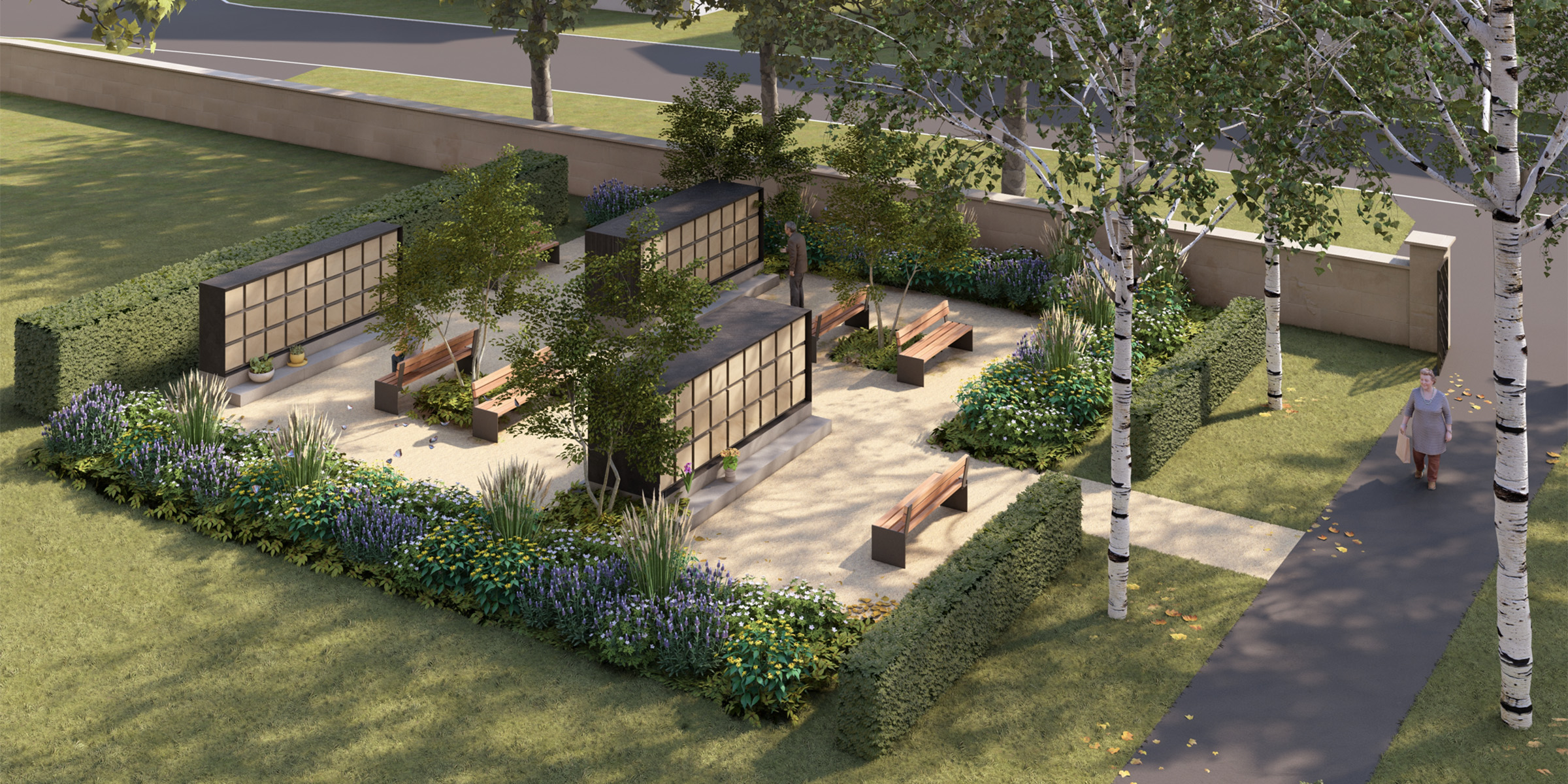 Geplant ist eine Anlage mit mehreren versetzt angeordneten Urnenwänden. Durch diese Anordnung entstehen kleine, platzartige Aufenthaltsbereiche mit Sitzgelegenheiten. Sie bieten Besucherinnen und Besuchern künftig einen geschützten, ruhigen Ort zum Verweilen und Erinnern.
