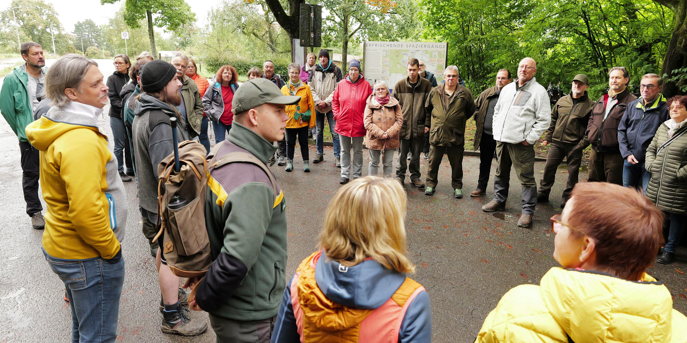 Die Stadtverwaltung hat im Rahmen einer öffentlichen Gemeinderatssitzung am vergangenen Samstag über aktuelle und geplante Maßnahmen im Stadtwald informiert. Erster Bürgermeister Benjamin Dihm und Revierförster Jonathan Sachs freuten sich über das große Interesse – knapp 50 Menschen folgten ihnen vom Wanderparkplatz an der Alten Poststraße auf einer drei Kilometer langen Schleife durch den Wald.