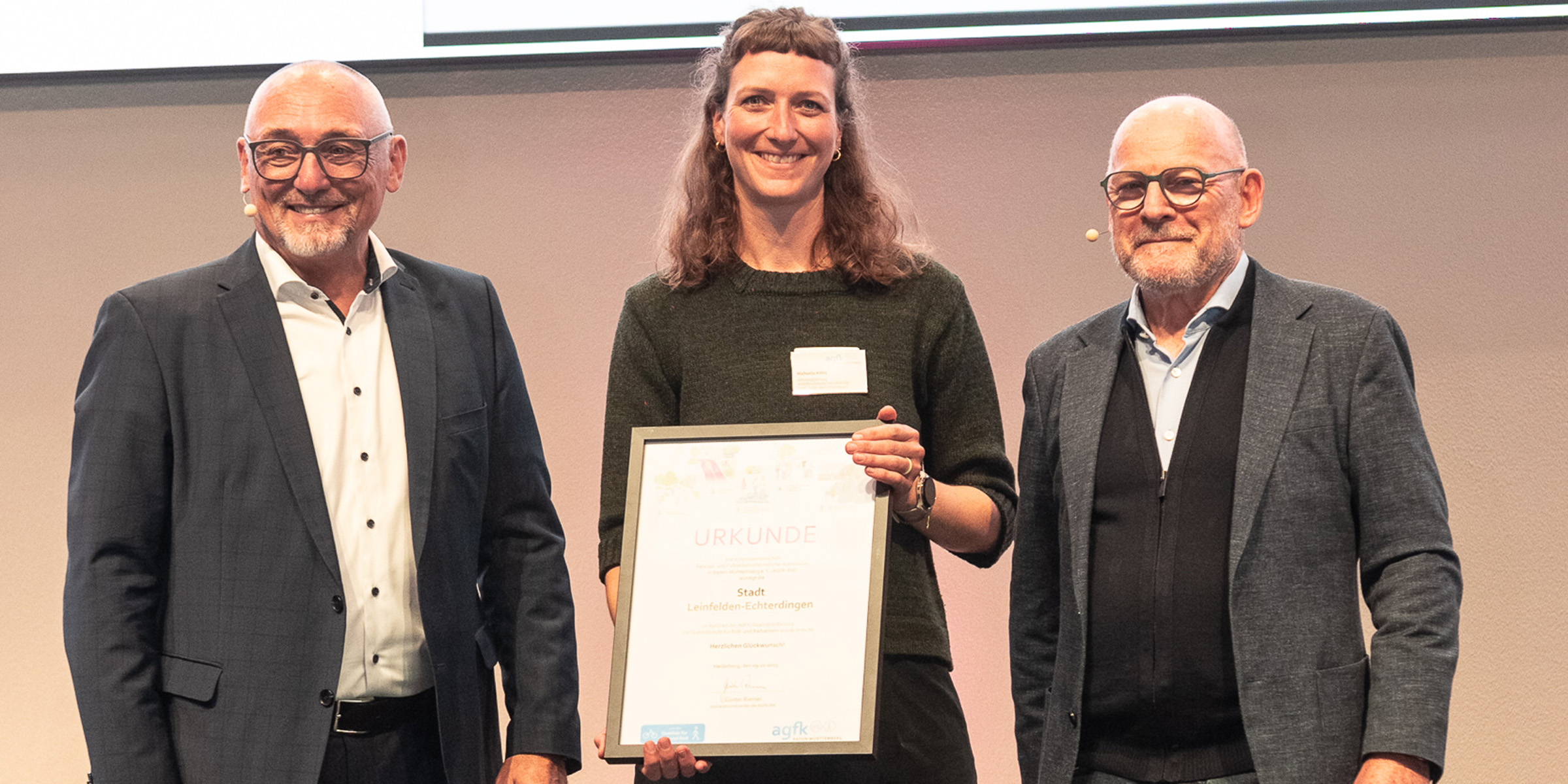 Leinfelden-Echterdingen wurde als eine von zwölf Kommunen in Baden-Württemberg im Rahmen der AGFK-BW-Qualitätsoffensive mit der Qualitätsstufe für Fuß- und Radverkehr ausgezeichnet. Die Ehrung übernahmen Verkehrsminister Winfried Hermann MdL und AGFK-Vorstand Günter Riemer beim RadKONGRESS in Heidelberg.