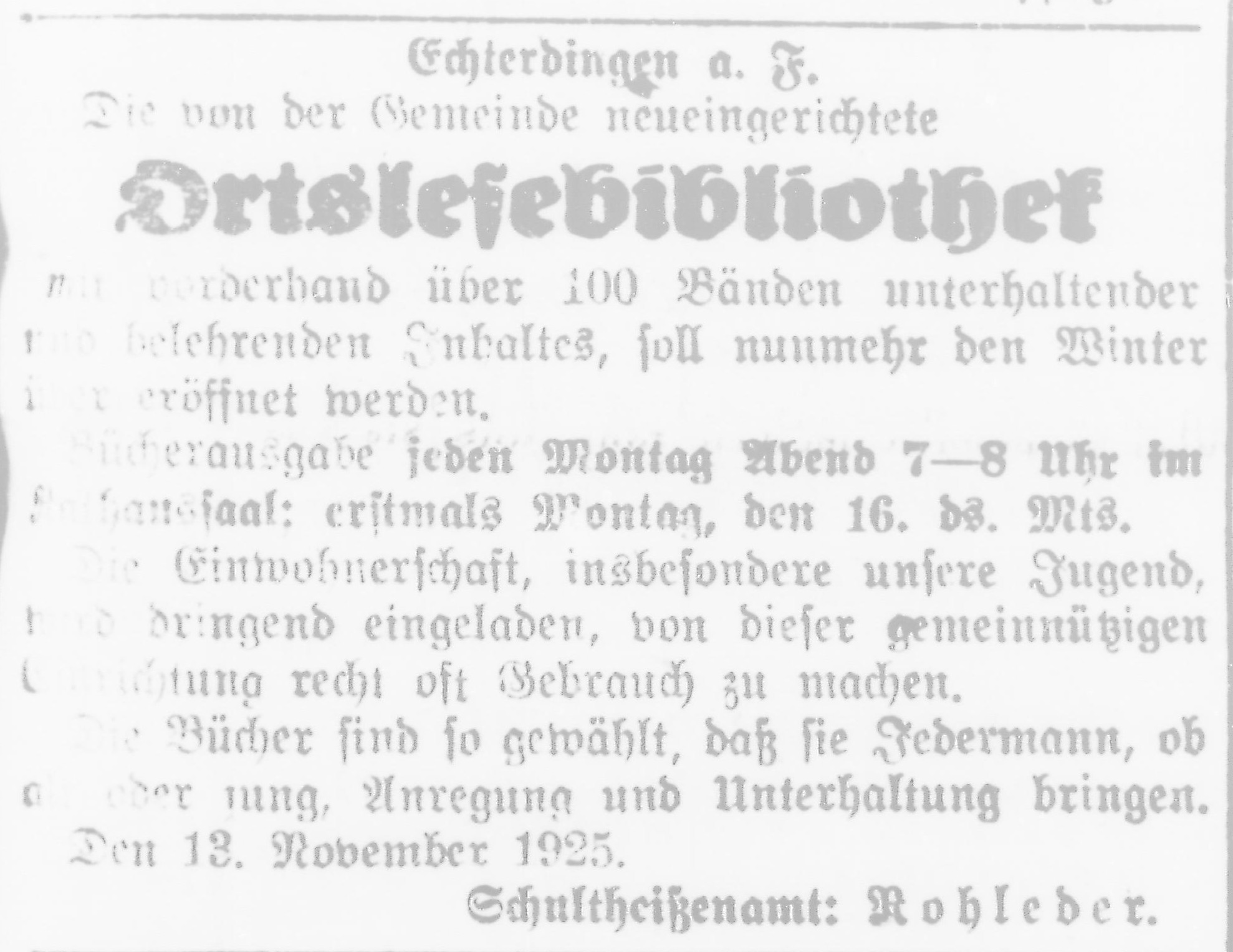Am 20. März 1924 erkannte der Echterdinger Gemeinderat die Notwendigkeit und das „allgemeine Volksbedürfnis“, eine eigene Bibliothek zu gründen. Diese Einrichtung sollte durch Steuern finanziert werden. Bis es zur Umsetzung kam, dauerte es dann allerdings noch fast ein Jahr. Da man lange Zeit keine geeignete Person gefunden hatte, die die Bücherei leiten könnte, eröffnete die Echterdinger „Ortslesebibliothek“ erst am 10. Februar 1925. Die Bibliothek kam im Kellergeschoss des Rathauses Echterdingen unter.