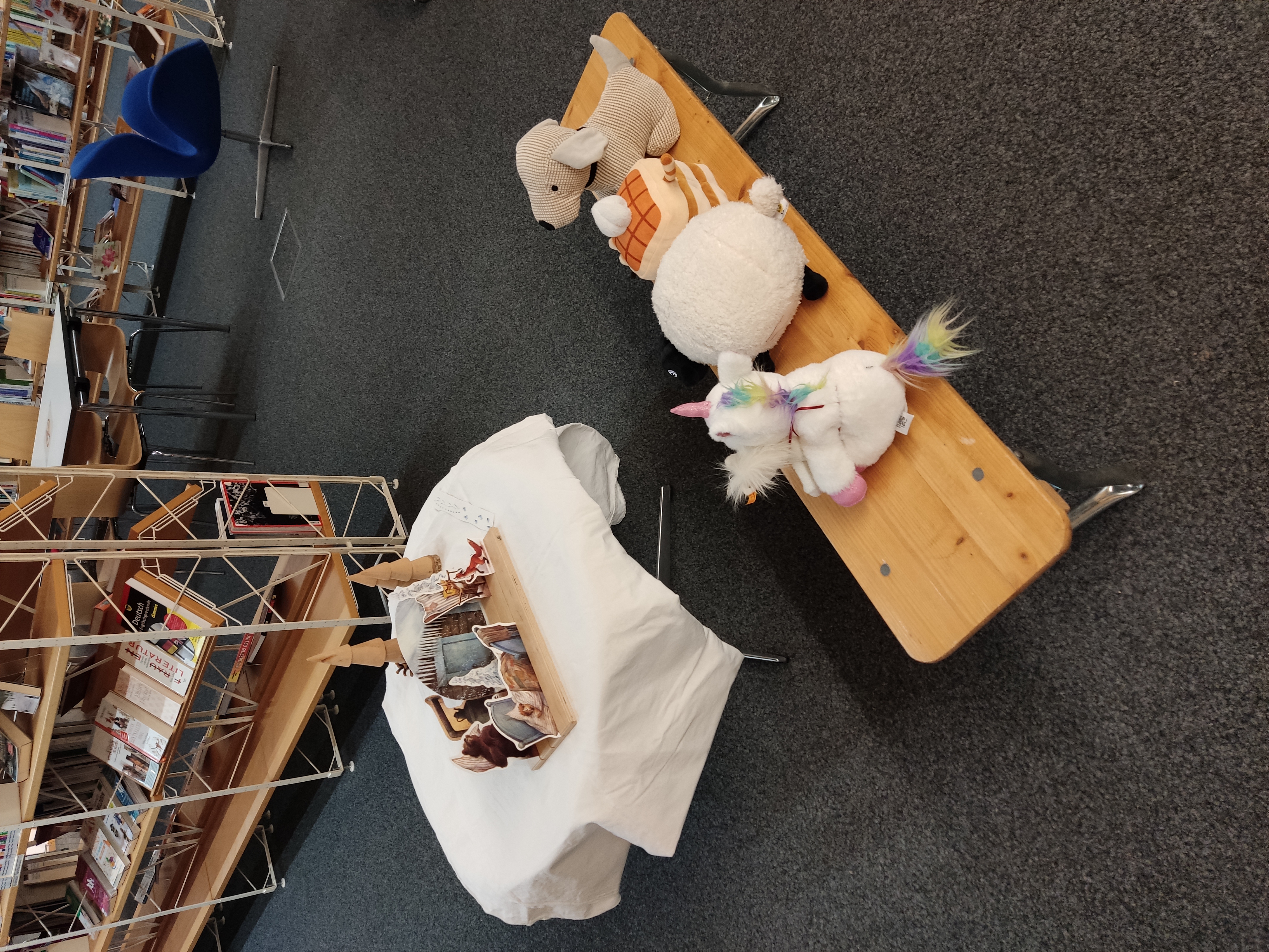 Osterhase Wuschel möchte für Ostern das Verstecken üben. Dafür hat er sich unsere Stadtbücherei ausgesucht und kleine Ostergeschenke in den Regalen der Bücherei versteckt.
