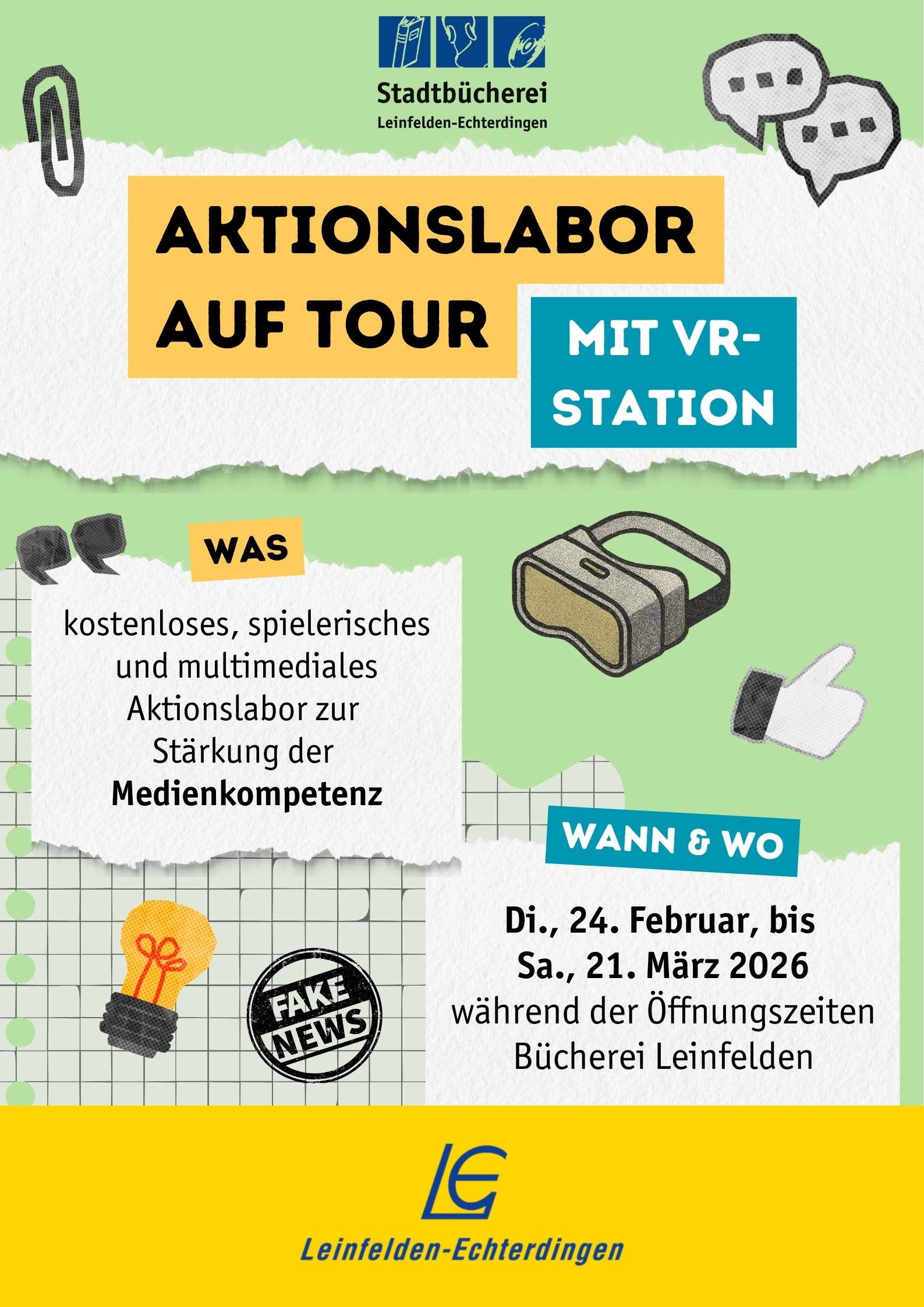 Nebenbei, spielerisch und kostenlos die eigene Medienkompetenz stärken? Das ist für alle Interessierten im multimedialen Aktionslabor in der Bücherei Leinfelden möglich. Das interaktive Angebot ermöglicht mit VR-Station und digitalen Spielen einen einfachen, unterhaltsamen Zugang zu Nachrichten- und Informationsfragen und lädt zum freien Ausprobieren, Testen und Informieren ein.