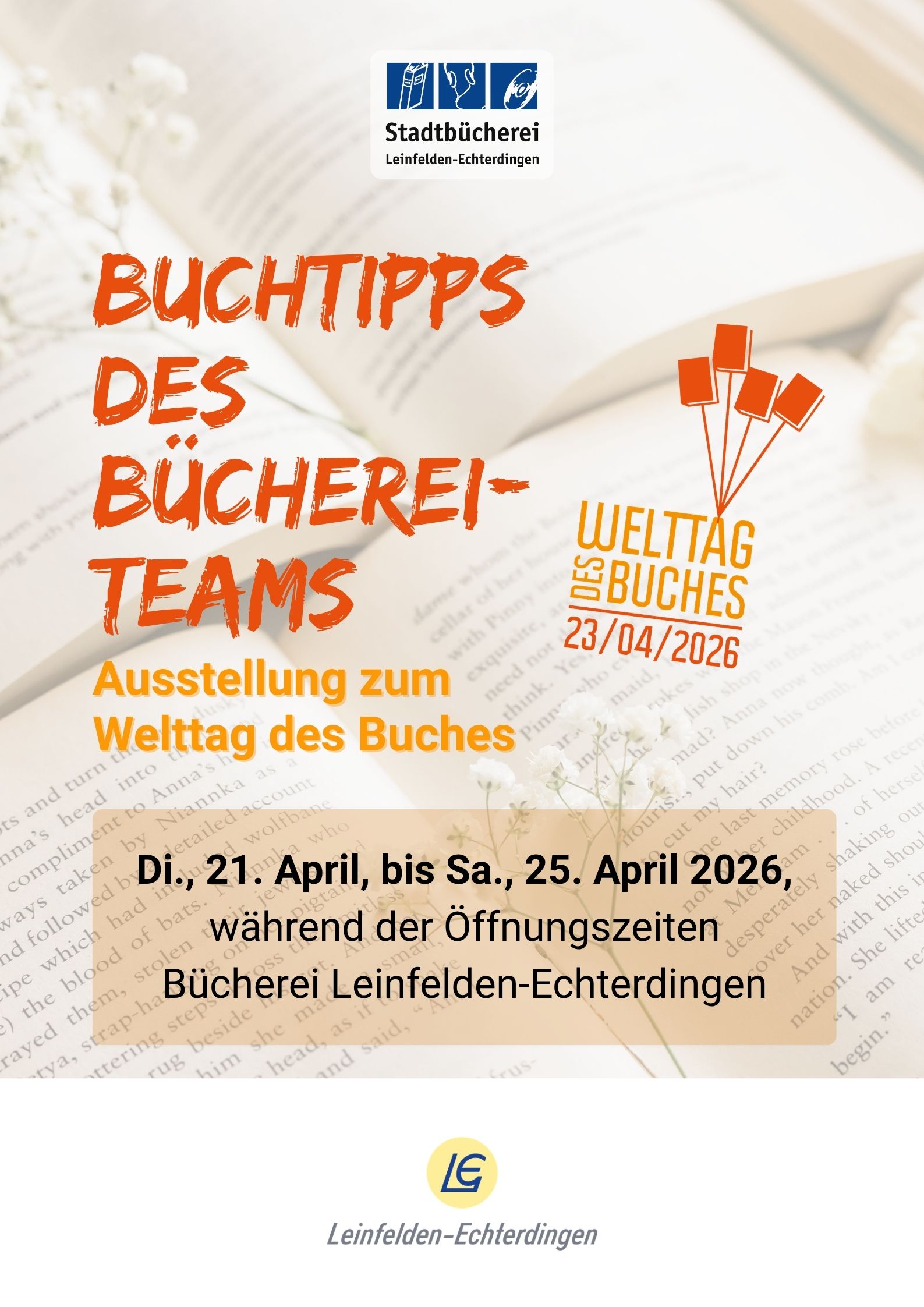 Anlässlich des Welttags des Buches am 23. April 2026 präsentieren die Büchereien Leinfelden und Echterdingen in der Woche vom 21. bis 25. April 2026 eine besondere Ausstellung mit persönlichen Buchempfehlungen der Bücherei-Teams.