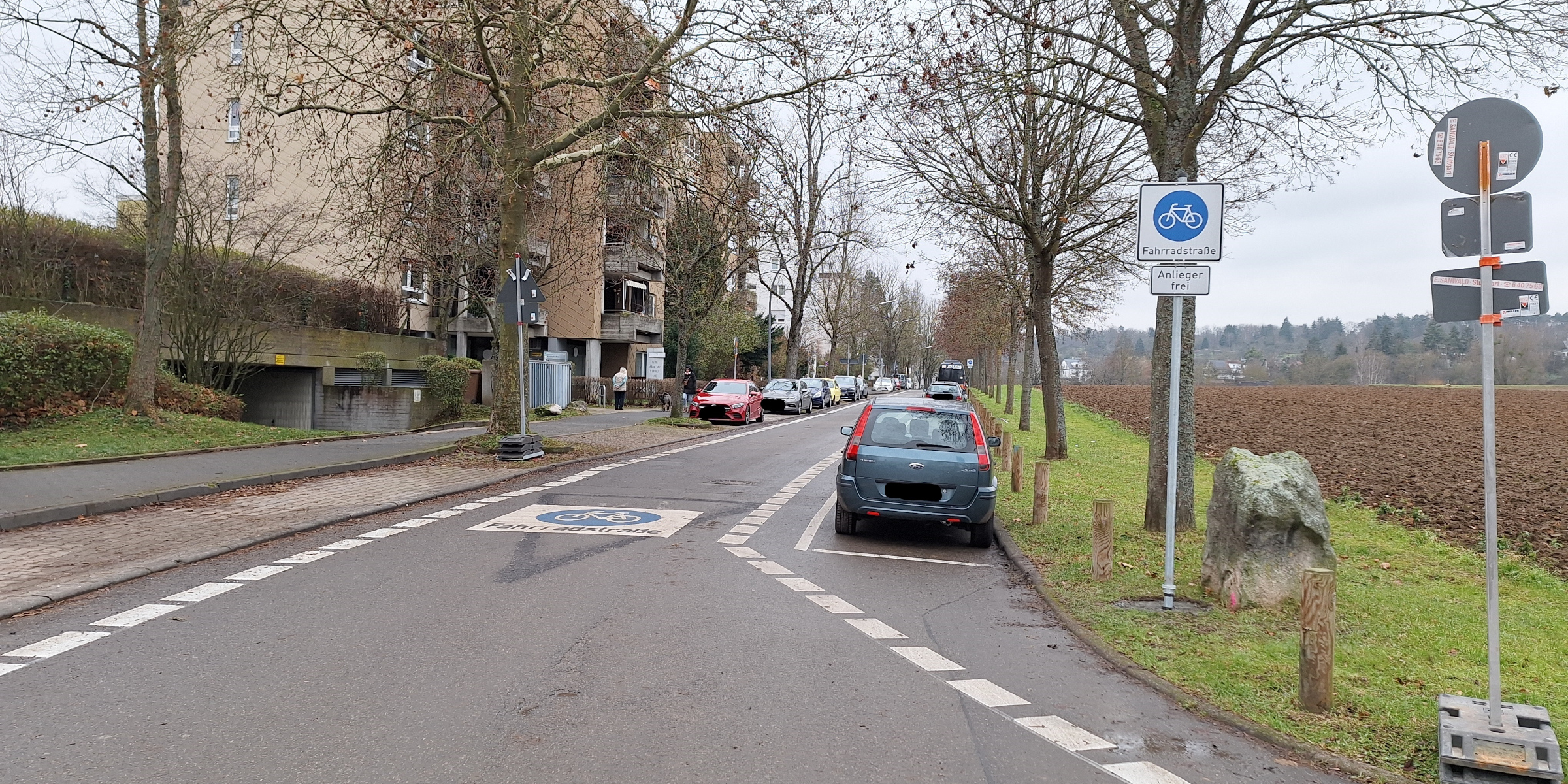 Die Goldäckerstraße ist durch das entsprechende Zusatzzeichen für den Kfz-Verkehr für Anlieger freigegeben bleiben. Weiterhin darf in den gekennzeichneten Flächen auf der Fahrbahn geparkt werden. Entlang parkender Fahrzeuge ist ein Sicherheitstrennstreifen markiert, um sog. Dooring-Unfälle durch öffnende Fahrzeugtüren zu vermeiden.
