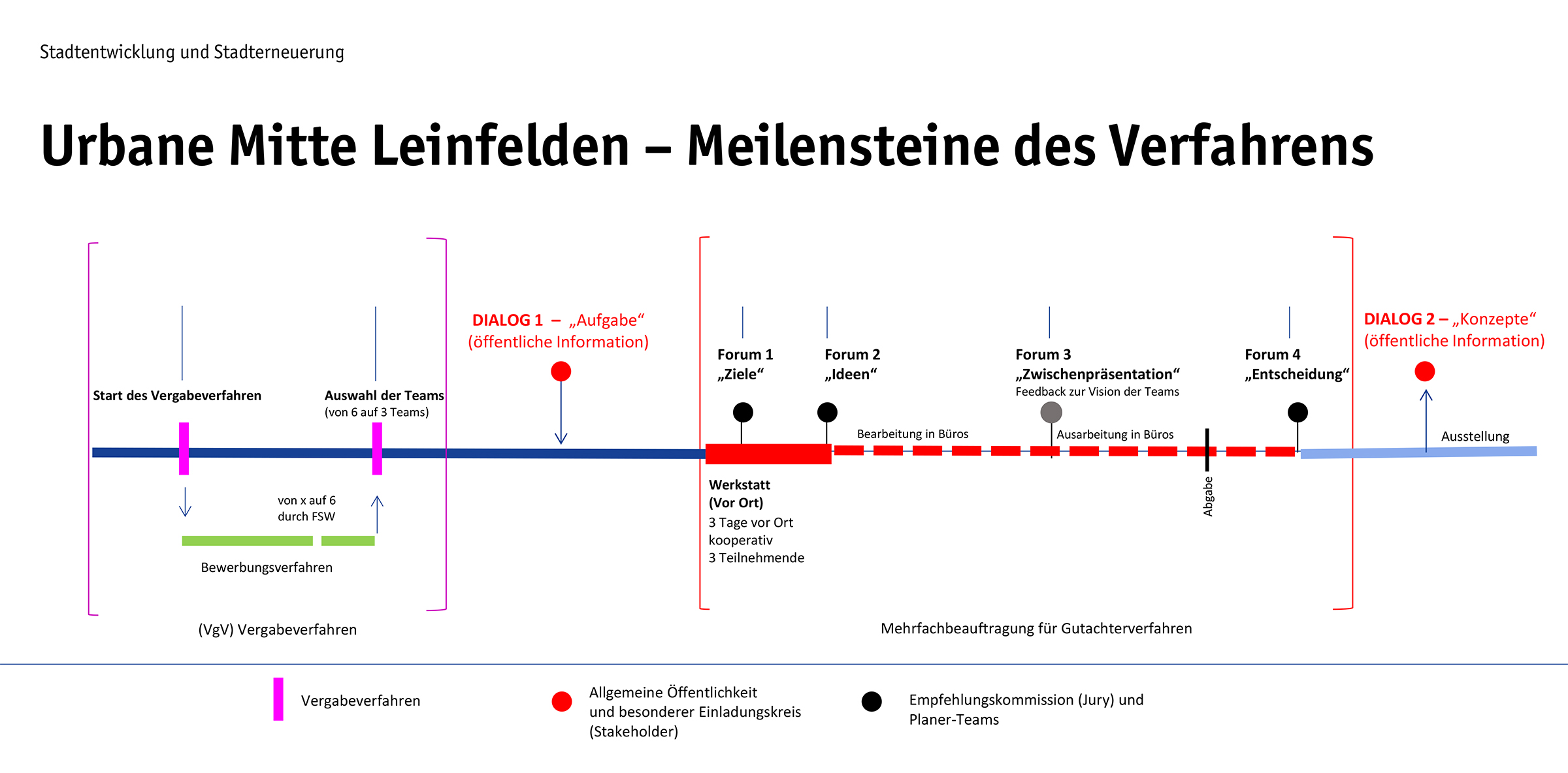 Dieser Wandel soll durch Dialog entstehen. Im Rahmen eines kooperativen Verfahrens mit vorgeschalteter Bürger-Ideen-Veranstaltung erarbeiteten interdisziplinäre Planungsteams – bestehend aus Büros für Stadtplanung und Landschaftsarchitektur – neue Ideen für eine neue urbane Mitte. Wir danken an dieser Stelle allen drei Planerteams für die sehr kollegiale Beteiligung an diesem besonderen dialogischen Werkstattverfahren.
