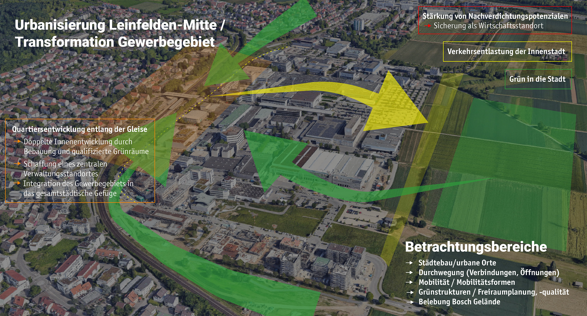 Neben dem Boschwerksgelände wurden auch das gesamte Gewerbegebiet, das Rathaus-Umfeld, die Bahnhofstraße und der Neue Markt in die Planungen einbezogen. Im Mittelpunkt steht dabei der sogenannte „Sprung über die Gleise“ – das Ziel, die beiden Stadtseiten räumlich und funktional miteinander zu verbinden.