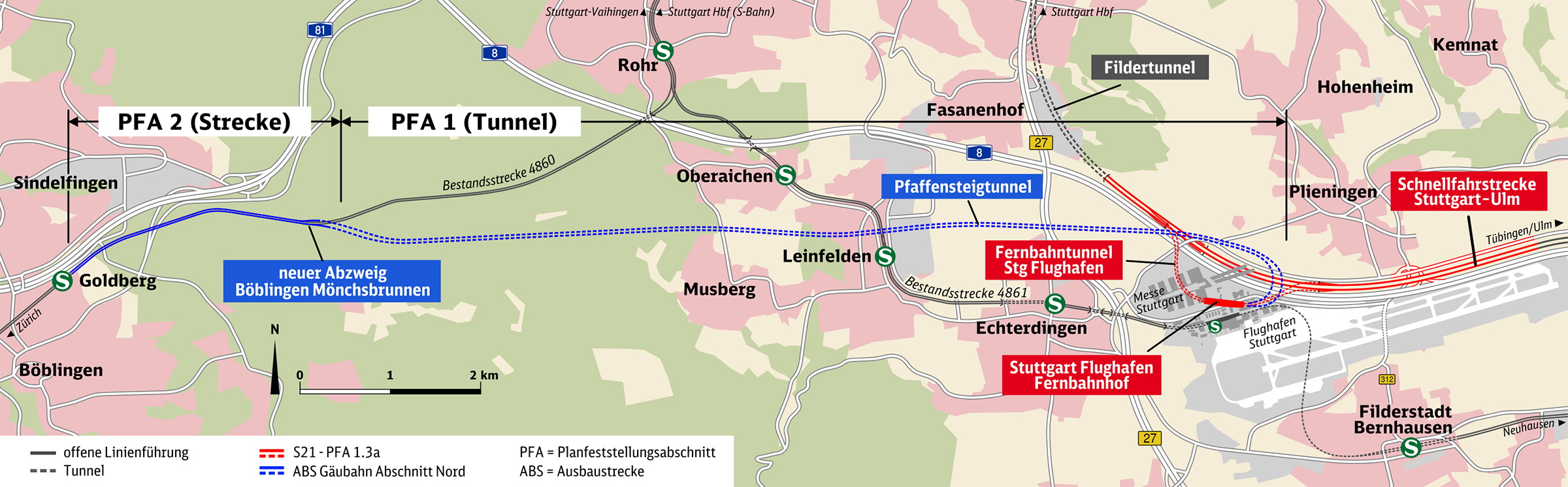Das Planfeststellungsverfahren wurde seiner Zeit in zwei Planfeststellungsabschnitte (PFA) aufgeteilt, Unterabschnitt 1.3a (ICE-Trasse mit Flughafenanschluss) und 1.3b (Gäubahnführung). Für die Führung der Gäubahn wurden verschiedene Varianten diskutiert. Während die Planungen und Arbeiten zu Unterabschnitt 1.3a mit der Eröffnung des Fernbahnhofs am Flughafen abgeschlossen sein werden, wird der Ausbau der Gäubahnstrecke die Stadt Leinfelden-Echterdingen noch weiter beschäftigen.