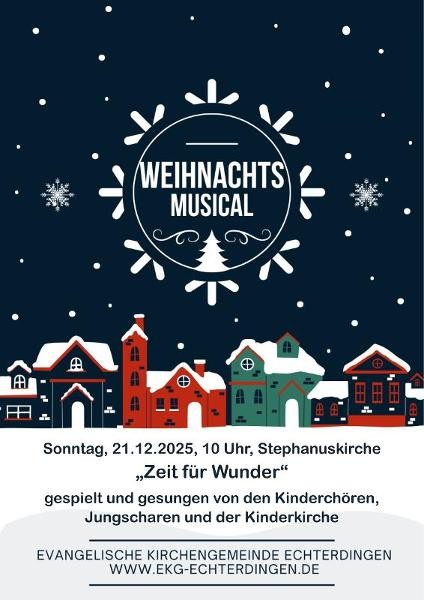 Am 4. Adventssonntag, 21. Dezember 2025 wird um 10 Uhr im Gottesdienst in der Stephanuskirche Echterdingen das Kindermusical „Zeit für Wunder“ aufgeführt.
