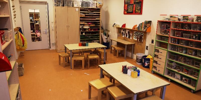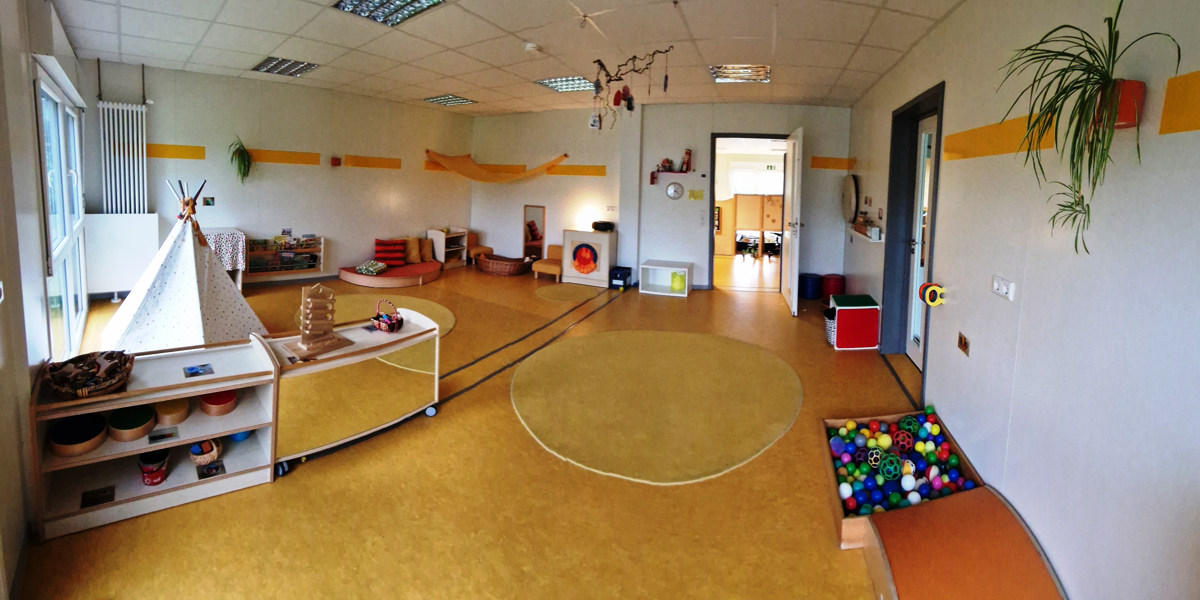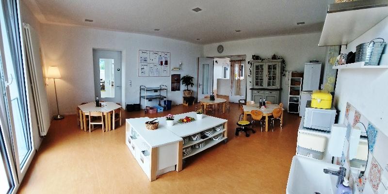 Das Kinderhaus bietet Platz für 78 Kinder von 2 Jahren bis zum Schuleintritt. Der Pavillon für die Kleinkinder bietet Platz für 20 Kinder von 1 bis 3 Jahren.
